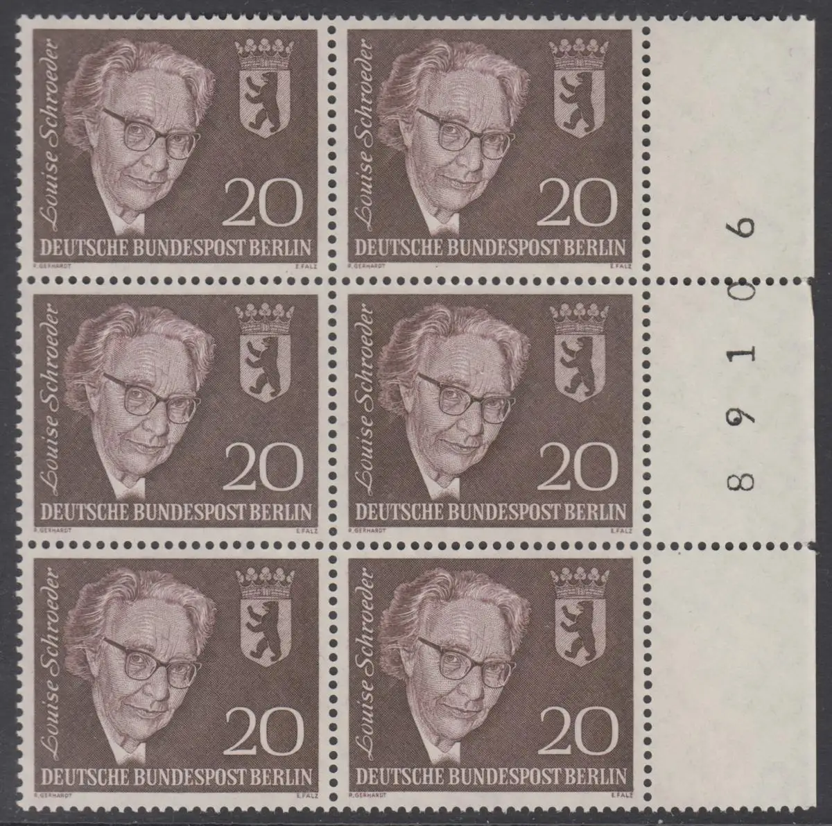 BERLIN 1961 Michel-Nummer 198 postfrisch vert.BLOCK(6) RÄNDER rechts m/ Bogenzähler (89106) - Todestag von Louise Schröder, Politikerin