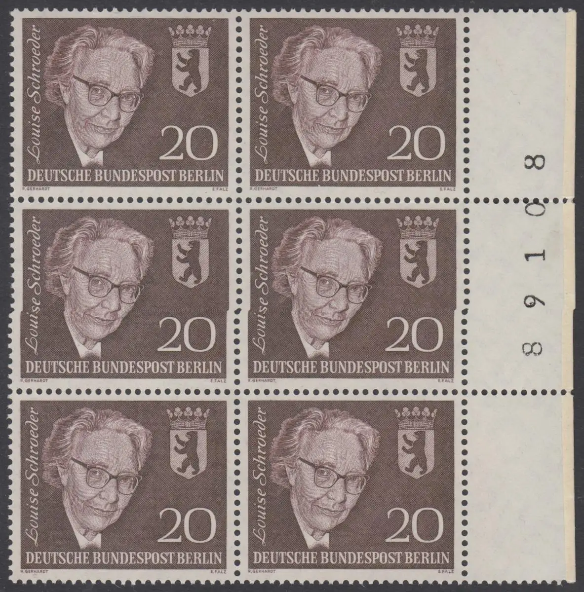 BERLIN 1961 Michel-Nummer 198 postfrisch vert.BLOCK(6) RÄNDER rechts m/ Bogenzähler (89108) - Todestag von Louise Schröder, Politikerin