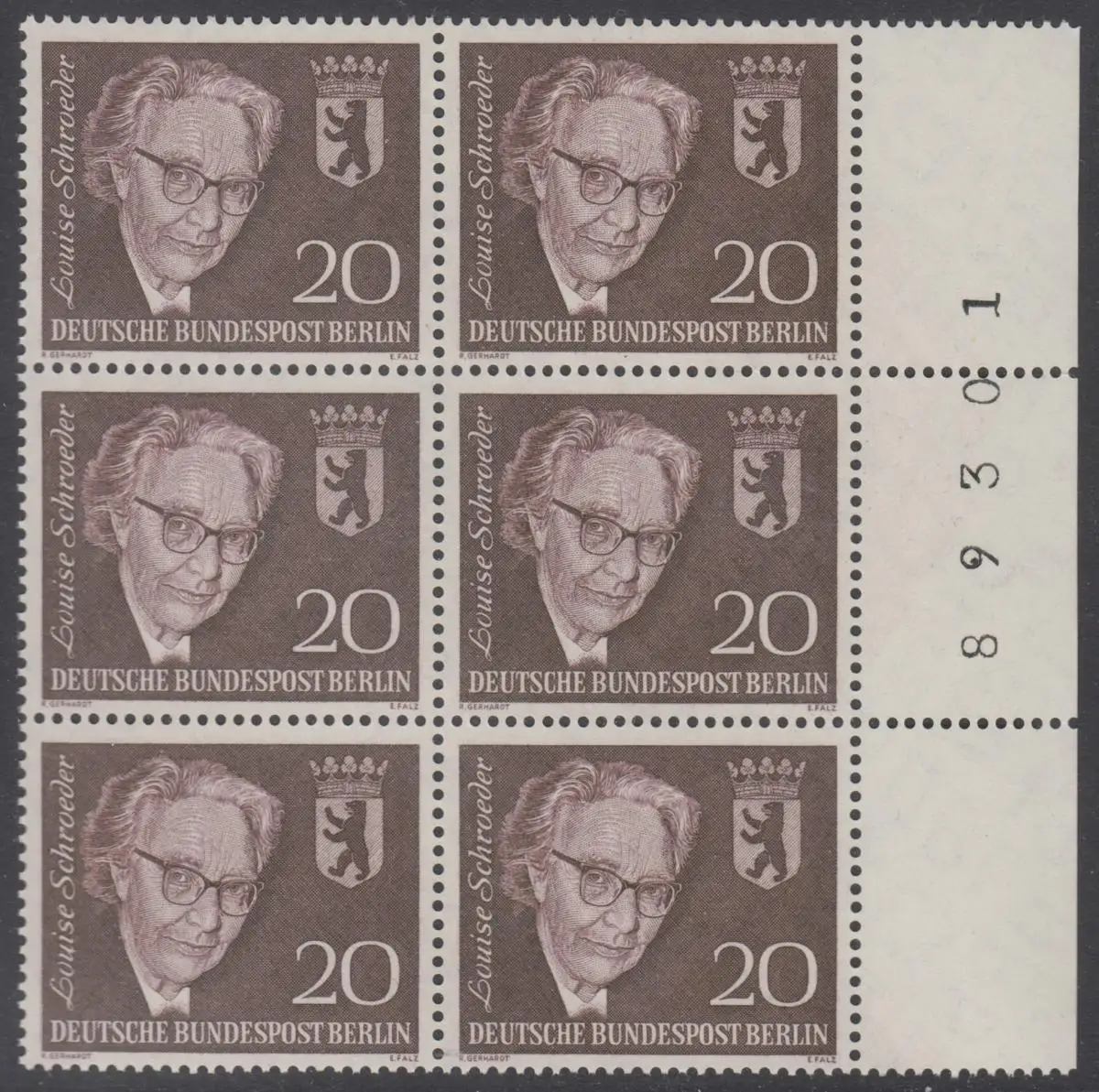 BERLIN 1961 Michel-Nummer 198 postfrisch vert.BLOCK(6) RÄNDER rechts m/ Bogenzähler (89301) - Todestag von Louise Schröder, Politikerin