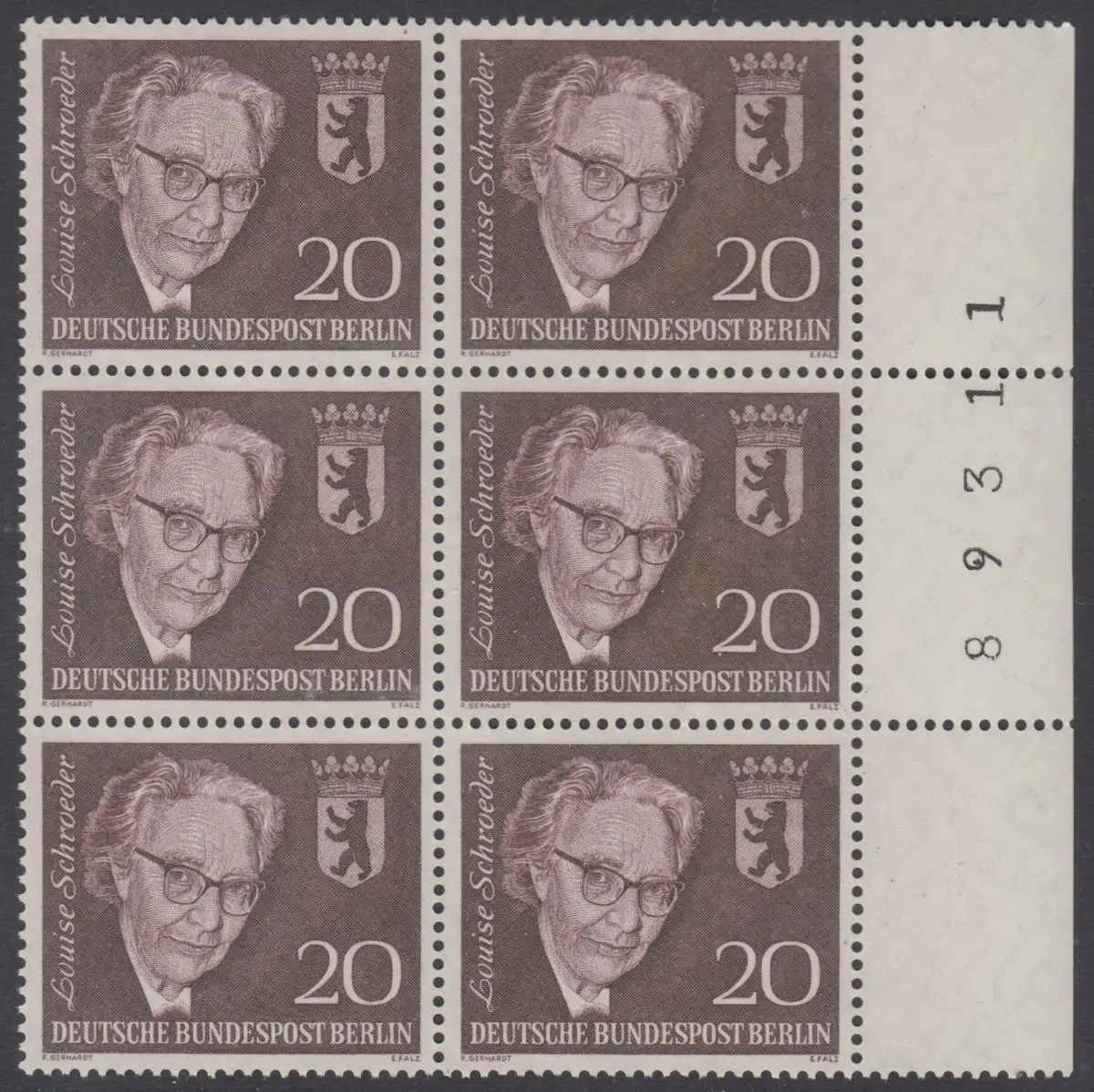 BERLIN 1961 Michel-Nummer 198 postfrisch vert.BLOCK(6) RÄNDER rechts m/ Bogenzähler (89311) - Todestag von Louise Schröder, Politikerin