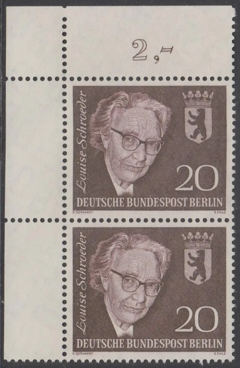 BERLIN 1961 Michel-Nummer 198 postfrisch vert.PAAR ECKRAND oben links - Todestag von Louise Schröder, Politikerin