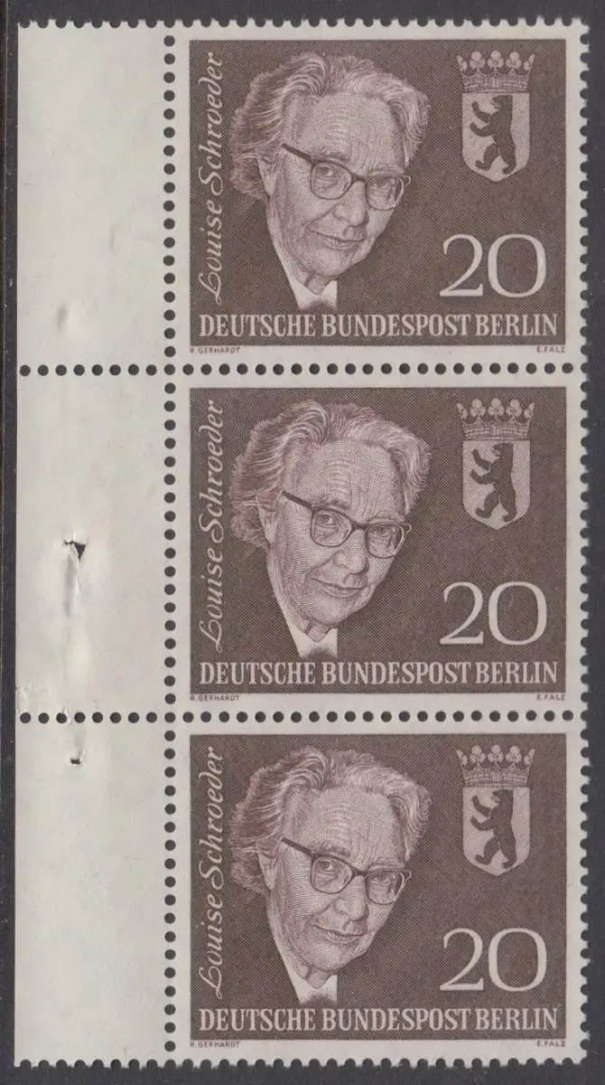 BERLIN 1961 Michel-Nummer 198 postfrisch vert.STRIP(3) Ränder links - Todestag von Louise Schröder, Politikerin