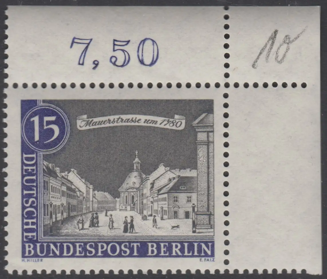 BERLIN 1962 Michel-Nummer 220 postfrisch EINZELMARKE ECKRAND oben rechts (b) - Alt-Berlin: Mauerstraße
