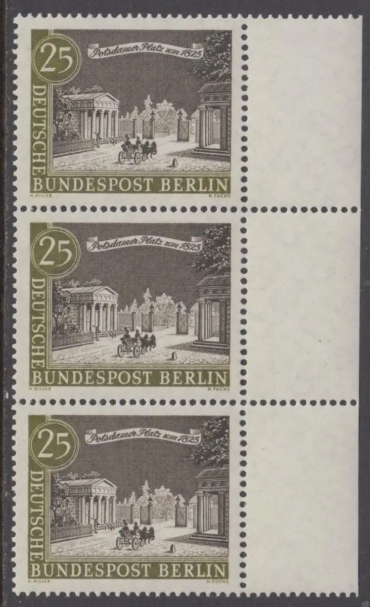 BERLIN 1962 Michel-Nummer 222 postfrisch vert.STRIP(3) RÄNDER rechts - Alt-Berlin: Potsdamer Platz
