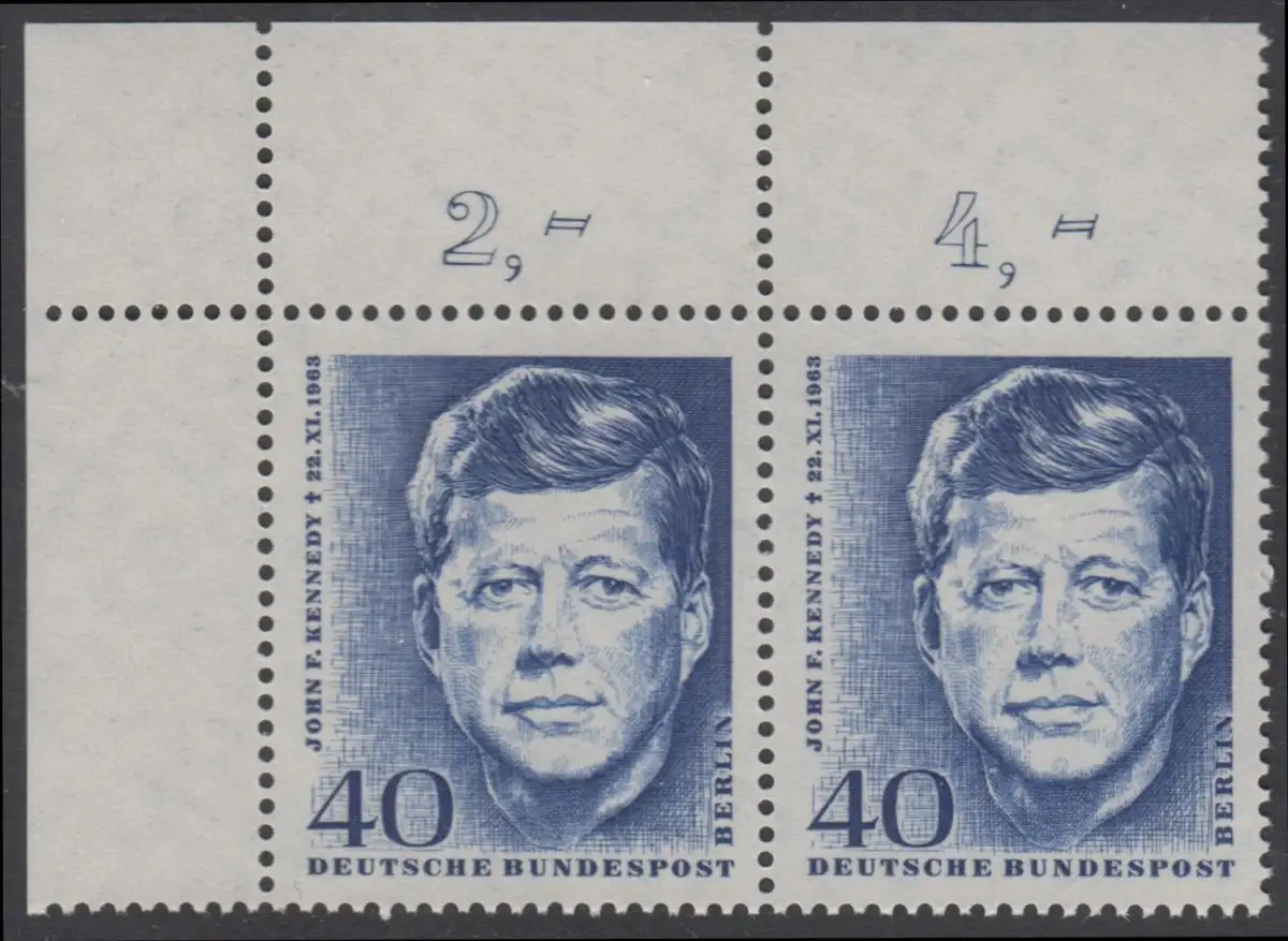 BERLIN 1964 Michel-Nummer 241 postfrisch horiz.PAAR ECKRAND oben links - John F. Kennedy, US-Präsident
