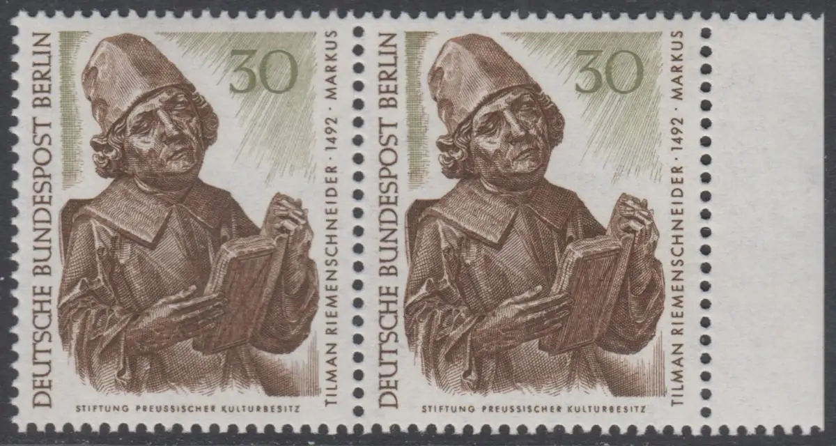 BERLIN 1967 Michel-Nummer 305 postfrisch horiz.PAAR RAND rechts - Berliner Kunstschätze: Evangelist Markus, Detail des Münnerstädter Altars