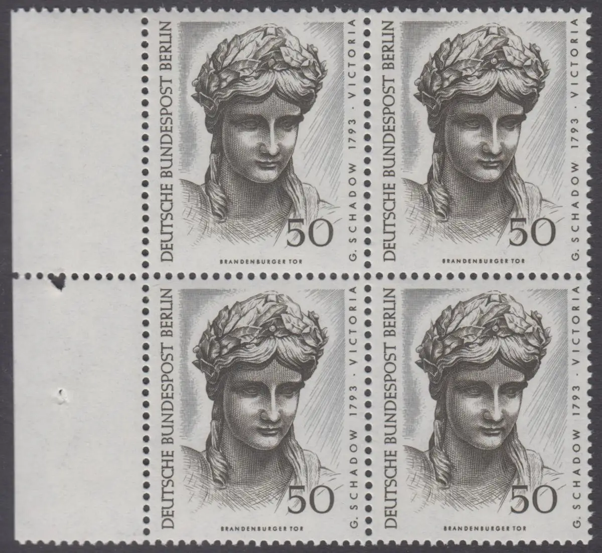 BERLIN 1967 Michel-Nummer 306 postfrisch BLOCK RÄNDER links - Berliner Kunstschätze: Kopf der Victoria, Detail der Quadriga auf dem Brandenburger Tor