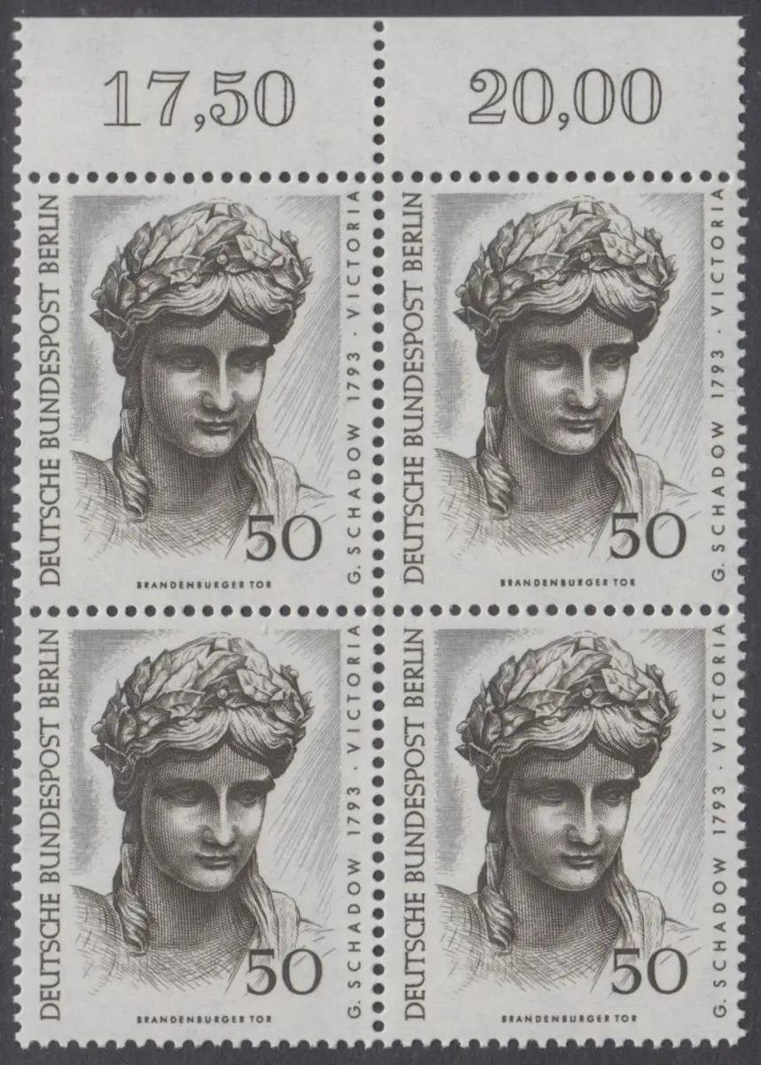 BERLIN 1967 Michel-Nummer 306 postfrisch BLOCK RÄNDER oben (a04) - Berliner Kunstschätze: Kopf der Victoria, Detail der Quadriga auf dem Brandenburger Tor
