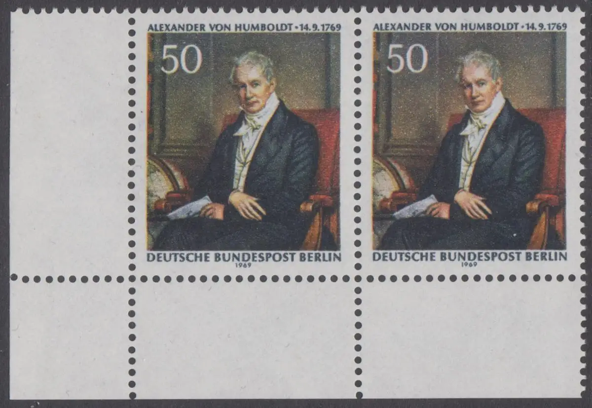 BERLIN 1969 Michel-Nummer 346 postfrisch horiz.PAAR ECKRAND unten links - Alexander Freiherr von Humboldt, Naturforscher und Gelehrter