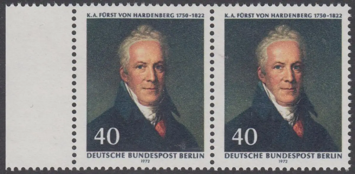 BERLIN 1972 Michel-Nummer 440 postfrisch horiz.PAAR RAND links - Karl August Fürst von Hardenberg, preuß. Staatsmann