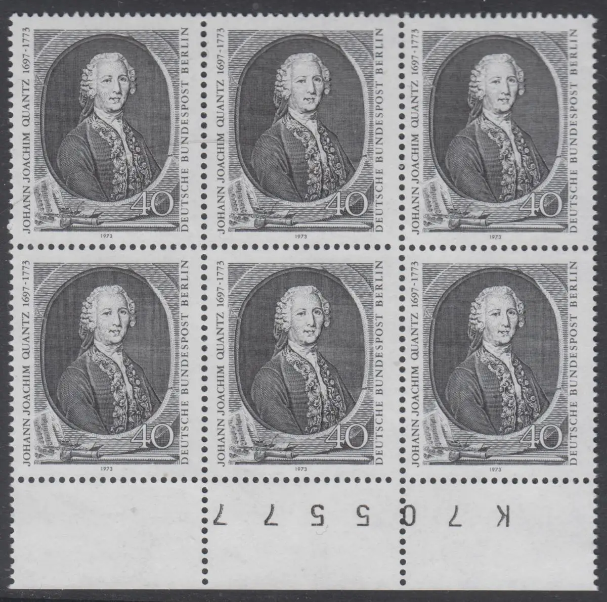 BERLIN 1973 Michel-Nummer 454 postfrisch horiz.BLOCK RÄNDER unten (m/ Bogenzähler) - Johann Joachim Quantz, Flötist und Komponist