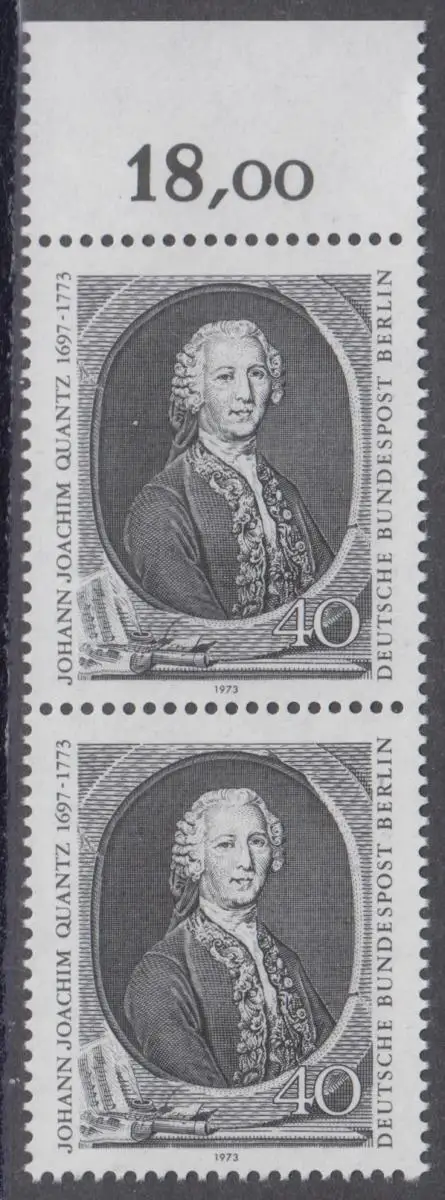 BERLIN 1973 Michel-Nummer 454 postfrisch vert.PAAR RAND oben (k) - Johann Joachim Quantz, Flötist und Komponist