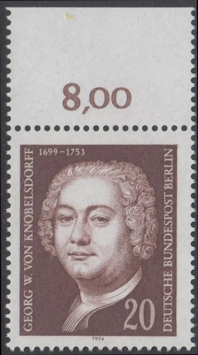 BERLIN 1974 Michel-Nummer 464 postfrisch EINZELMARKE RAND oben (g) - Georg Wenzeslaus von Knobelsdorff, Baumeister und Maler