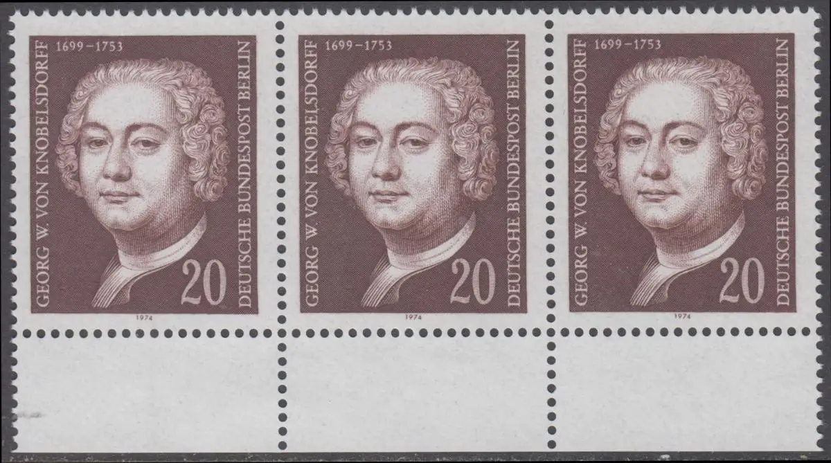 BERLIN 1974 Michel-Nummer 464 postfrisch horiz.STRIP(3) RÄNDER unten - Georg Wenzeslaus von Knobelsdorff, Baumeister und Maler