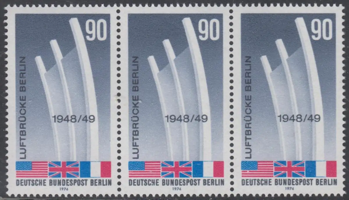 BERLIN 1974 Michel-Nummer 466 postfrisch horiz.STRIP(3) - Beendigung der Blockade Berlins; Berliner Luftbrücke