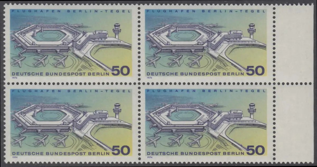 BERLIN 1974 Michel-Nummer 477 postfrisch BLOCK RÄNDER rechts - Inbetriebnahme des neuen Flughafens Berlin-Tegel