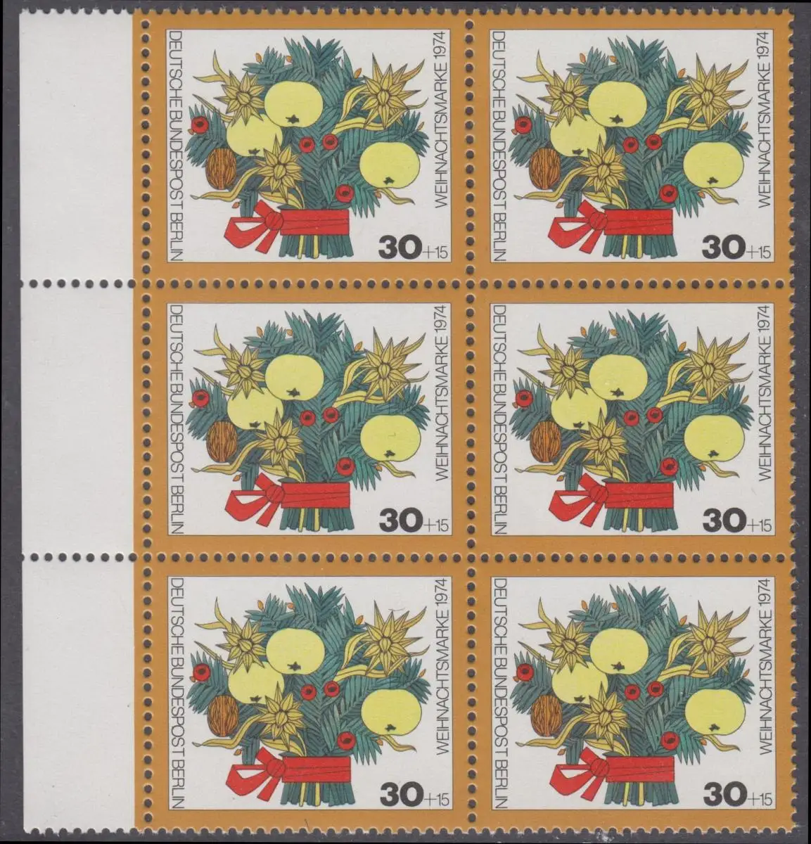 BERLIN 1974 Michel-Nummer 481 postfrisch vert.BLOCK(6) RÄNDER links - Weihnachten