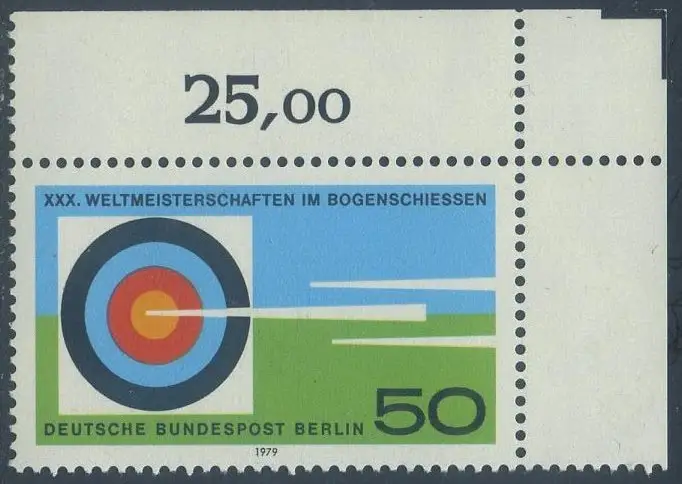 BERLIN 1979 Michel-Nummer 599 postfrisch EINZELMARKE ECKRAND oben rechts - Weltmeisterschaften im Bogenschießen, Berlin