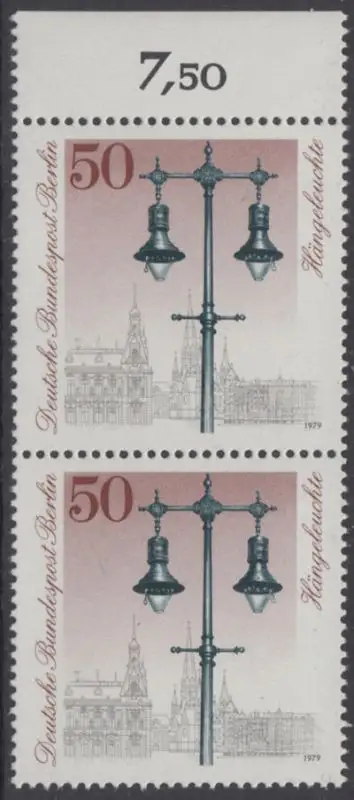 BERLIN 1979 Michel-Nummer 605 postfrisch vert.PAAR RAND oben - Historische Straßenlaternen: Gas-Hängeleuchte