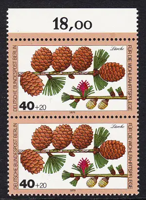 BERLIN 1979 Michel-Nummer 607 postfrisch vert.PAAR RAND oben (a) - Blätter, Blüten und Früchte des Waldes: Lärche