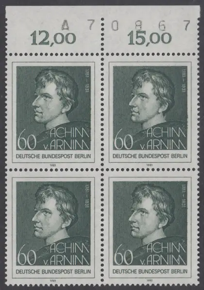 BERLIN 1981 Michel-Nummer 637 postfrisch BLOCK RÄNDER oben - Achim von Arnim, Dichter