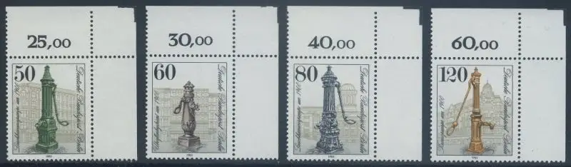 BERLIN 1983 Michel-Nummer 689-692 postfrisch SATZ(4) EINZELMARKEN ECKRÄNDER oben rechts - Historische Straßenpumpen in Berlin