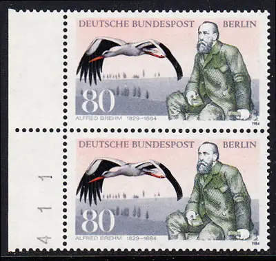 BERLIN 1984 Michel-Nummer 722 postfrisch vert.PAAR RAND links (BZ) - Alfred Edmund Brehm, Zoologe