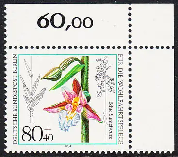 BERLIN 1984 Michel-Nummer 726 postfrisch EINZELMARKE ECKRAND oben rechts - Orchideen: Echte Sumpfwurz