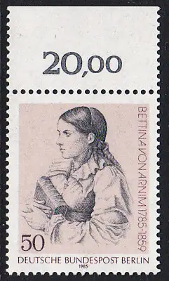 BERLIN 1985 Michel-Nummer 730 postfrisch EINZELMARKE RAND oben (b) - Bettina von Arnim, Schriftstellerin