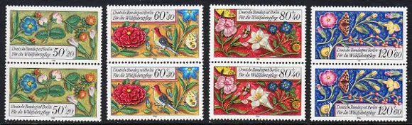 BERLIN 1985 Michel-Nummer 744-747 postfrisch SATZ(4) vert.PAARE - Miniaturen: Streublumen, Beeren, Vögel und Insekten
