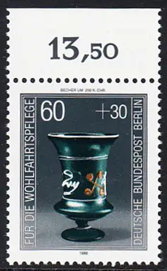 BERLIN 1986 Michel-Nummer 766 postfrisch EINZELMARKE RAND oben (a) - Kostbare Gläser: Becher mit Schlangenfadenmuster