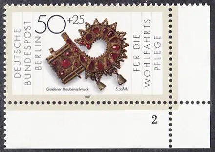 BERLIN 1987 Michel-Nummer 789 postfrisch EINZELMARKE ECKRAND unten rechts (FN) - Gold- und Silberschmiedekunst: Goldener Haubenschmuck