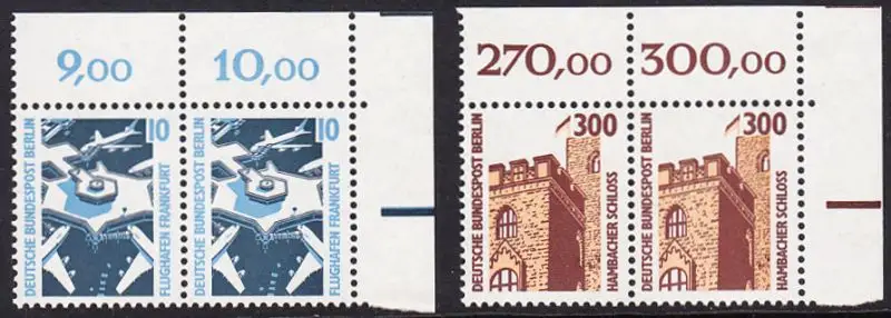BERLIN 1988 Michel-Nummer 798-799 postfrisch SATZ(2) horiz.PAARE ECKRÄNDER oben rechts - Sehenswürdigkeiten: Flughafen Frankfurt/Main / Hambacher Schloss