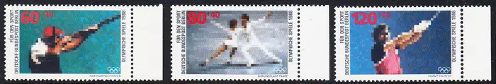 BERLIN 1988 Michel-Nummer 801-803 postfrisch SATZ(3) EINZELMARKEN RÄNDER rechts - Sporthilfe: Olympische Winterspiele, Calgary / Olympische Sommerspiele, Seoul