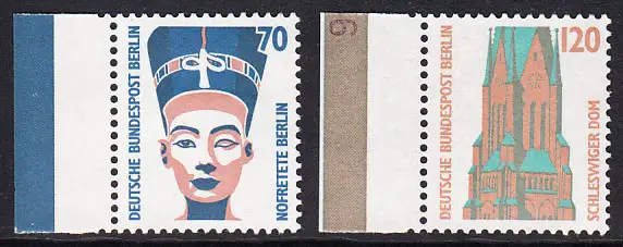 BERLIN 1988 Michel-Nummer 814-815 postfrisch SATZ(2) EINZELMARKEN RÄNDER links (a) - Sehenswürdigkeiten: Nofretete-Büste, Berlin / St.-Petri-Dom, Schleswig