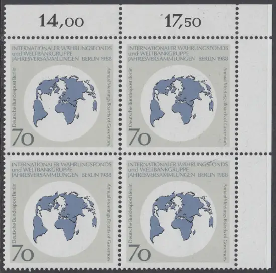 BERLIN 1988 Michel-Nummer 817 postfrisch BLOCK ECKRAND oben rechts - Jahresversammlungen des Internationalen Währungsfonds (IWF) und der Weltbankgruppe, Berlin