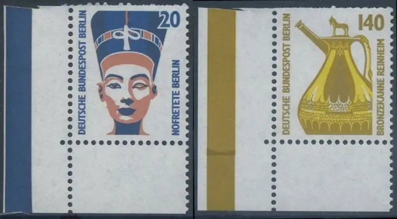 BERLIN 1989 Michel-Nummer 831-832 postfrisch SATZ(2) EINZELMARKEN ECKRÄNDER unten links - Sehenswürdigkeiten: Nofretete-Büste, Berlin / Bronzekanne, Reinheim