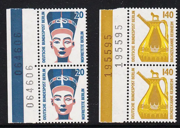 BERLIN 1989 Michel-Nummer 831-832 postfrisch SATZ(2) vert.PAARE RÄNDER links - Sehenswürdigkeiten: Nofretete-Büste, Berlin / Bronzekanne, Reinheim