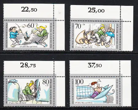 BERLIN 1990 Michel-Nummer 868-871 postfrisch SATZ(4) EINZELMARKEN ECKRÄNDER oben rechts - 125 Jahre Max und Moritz