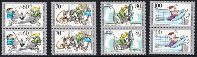 BERLIN 1990 Michel-Nummer 868-871 postfrisch SATZ(4) vert.PAARE - 125 Jahre Max und Moritz