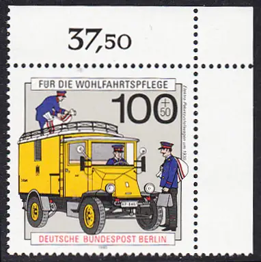 BERLIN 1990 Michel-Nummer 878 postfrisch EINZELMARKE ECKRAND oben rechts - Geschichte der Post und Telekommunikation: Elektro-Paketzustellwagen