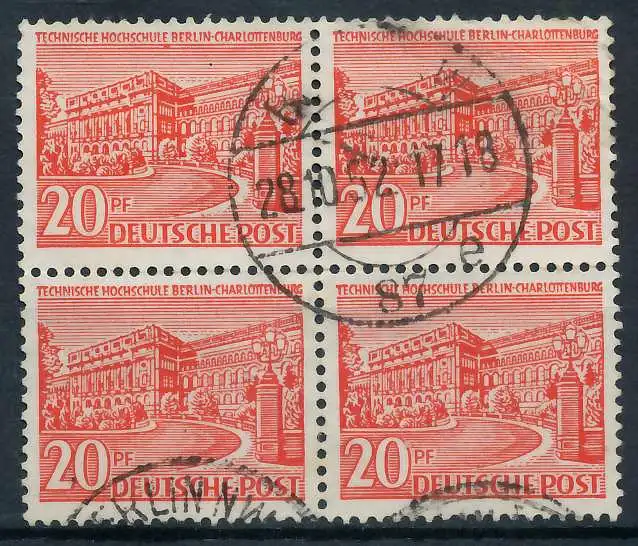 020 Pfg Freimarken Berliner Bauten, rechtes Gebäudeteil, mittlere Fensterreihe, im 5ten Fenster untere Linie nur halb gezeichnet (E mit 4 Querstrichen) im Feld 3 des 4er-Blocks und Schornstein auf dem Dach vom linken Gebäudeteil unter "H" von technische, im Feld 4 des 4er Blocks. Feld zwei des 4er Blocks Eckknick, daher nur als senkrechtes Paar gewertet.