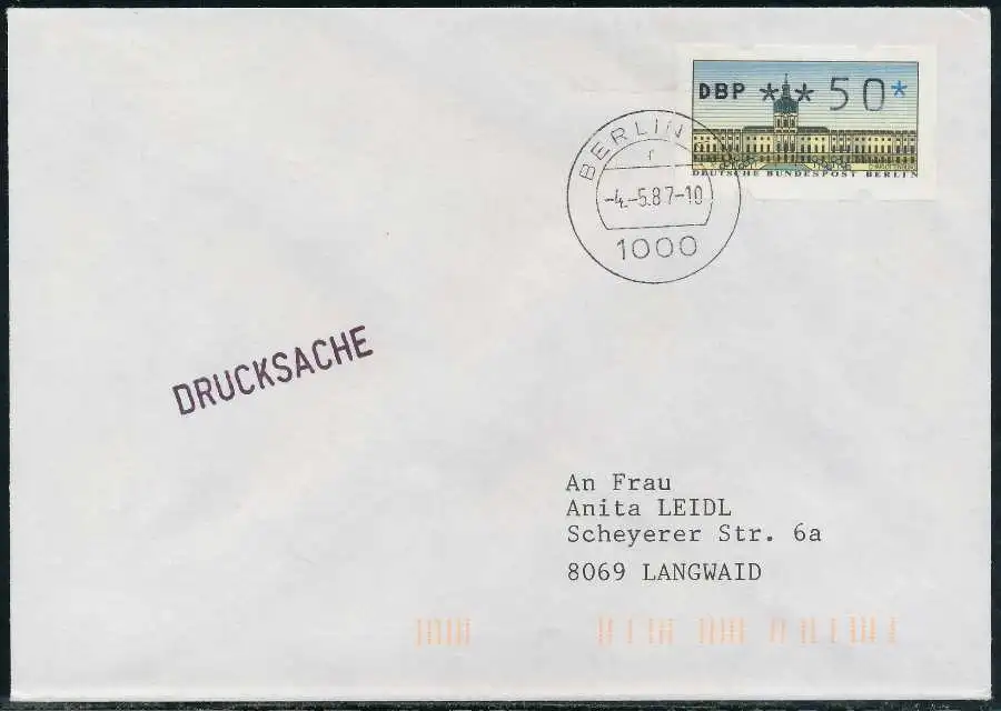 050 Pfg Wert aus der ATM-Ausgabe von 1987, FDC, auf Drucksache