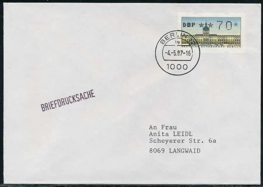 070 Pfg Wert aus der ATM-Ausgabe von 1987, FDC, auf Briefdrucksache