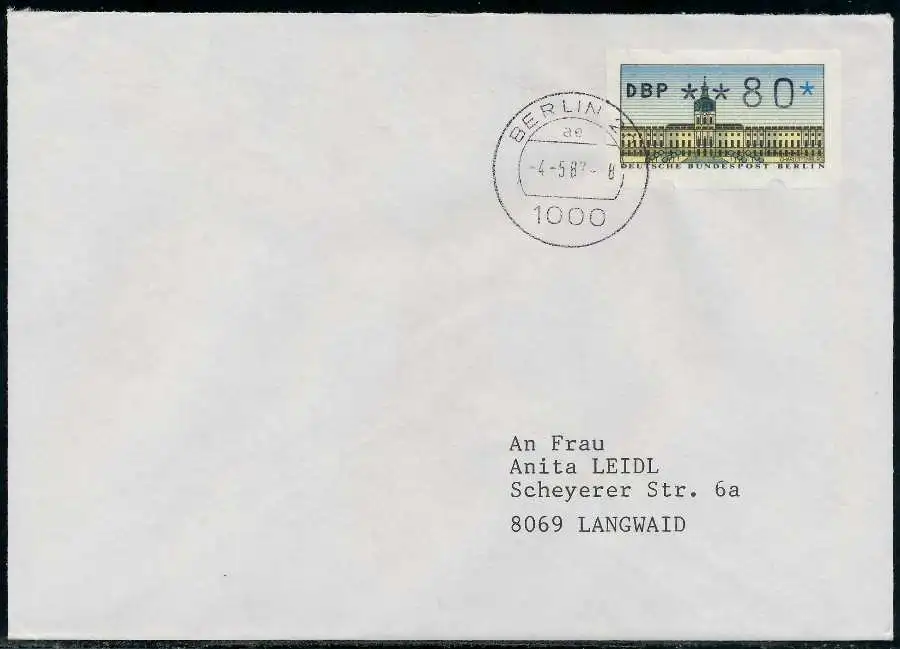 080 Pfg Wert aus der ATM-Ausgabe von 1987, FDC, auf normalem Brief