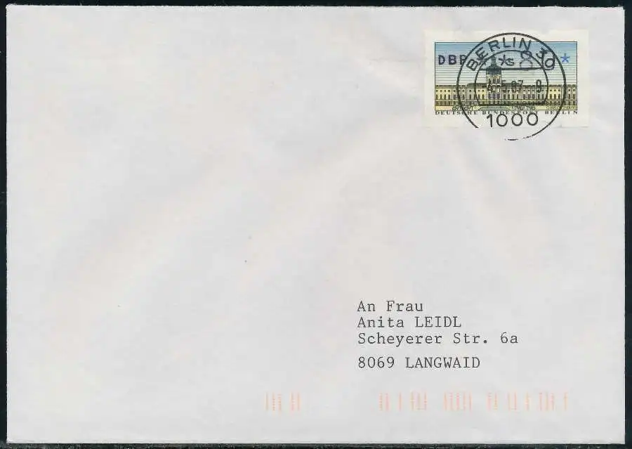080 Pfg Wert aus der ATM-Ausgabe von 1987, FDC, auf normalem Brief