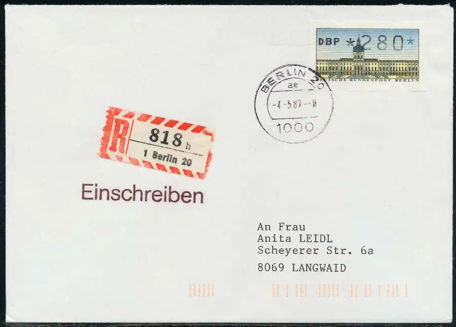 280 Pfg Wert aus der ATM-Ausgabe von 1987, FDC, auf Einschreiben