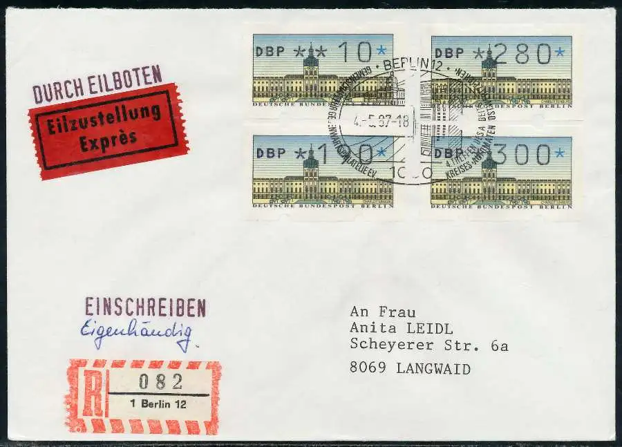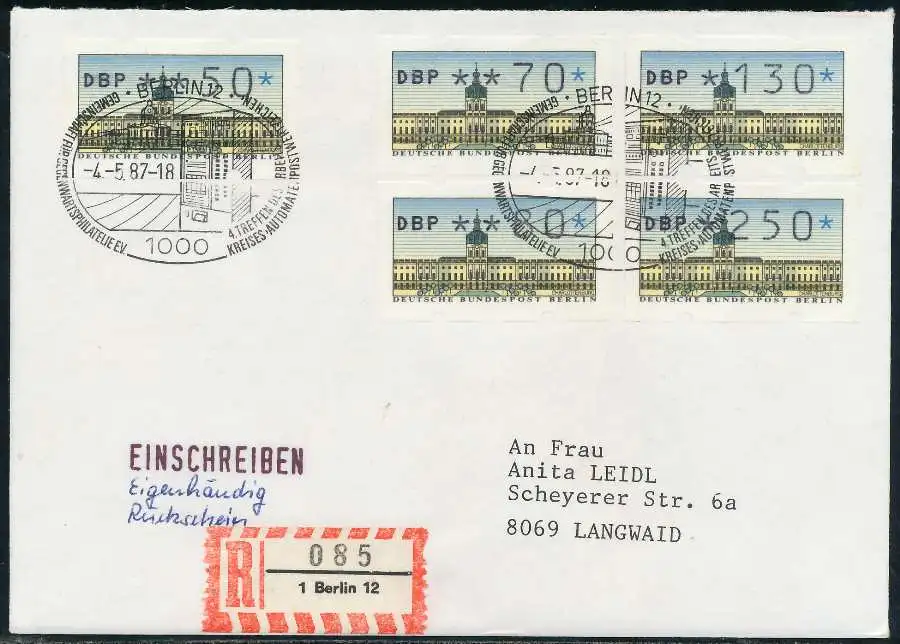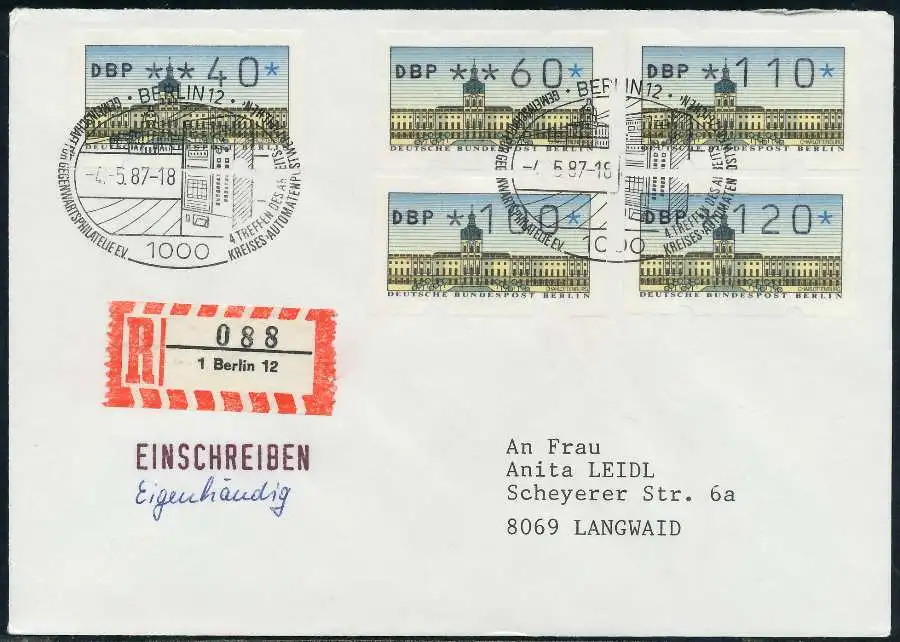 ATM-Ausgabe von 1987, Werte wie aus dem Versandstellen Satz VS1, verteilt auf 3 Briefe, jeweils mit Ersttagsstempel, Einschreiben, Eilboten, Eilzustellung, Eigenhändig, Rückschein