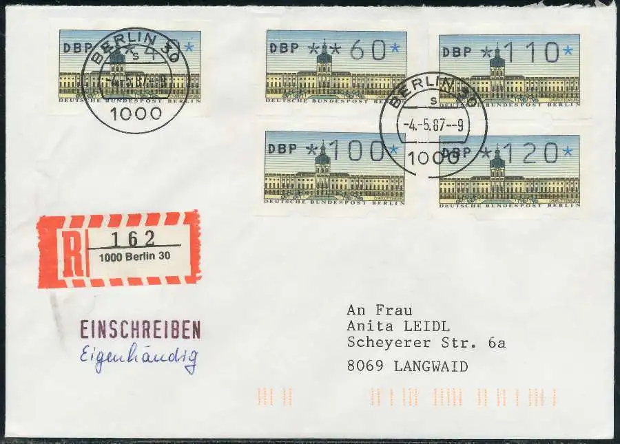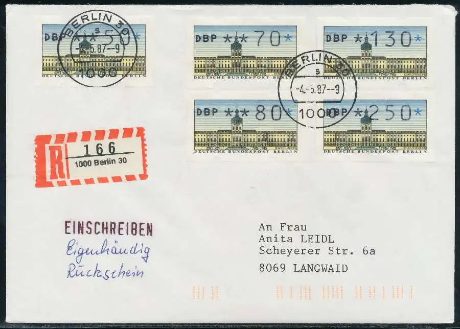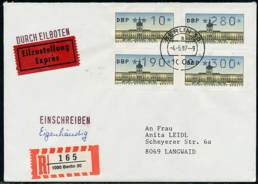 ATM-Ausgabe von 1987, Werte wie aus dem Versandstellen Satz VS1, verteilt auf 3 Briefe, jeweils mit Ersttagsstempel, Einschreiben, Eilboten, Eilzustellung, Eigenhändig, Rückschein