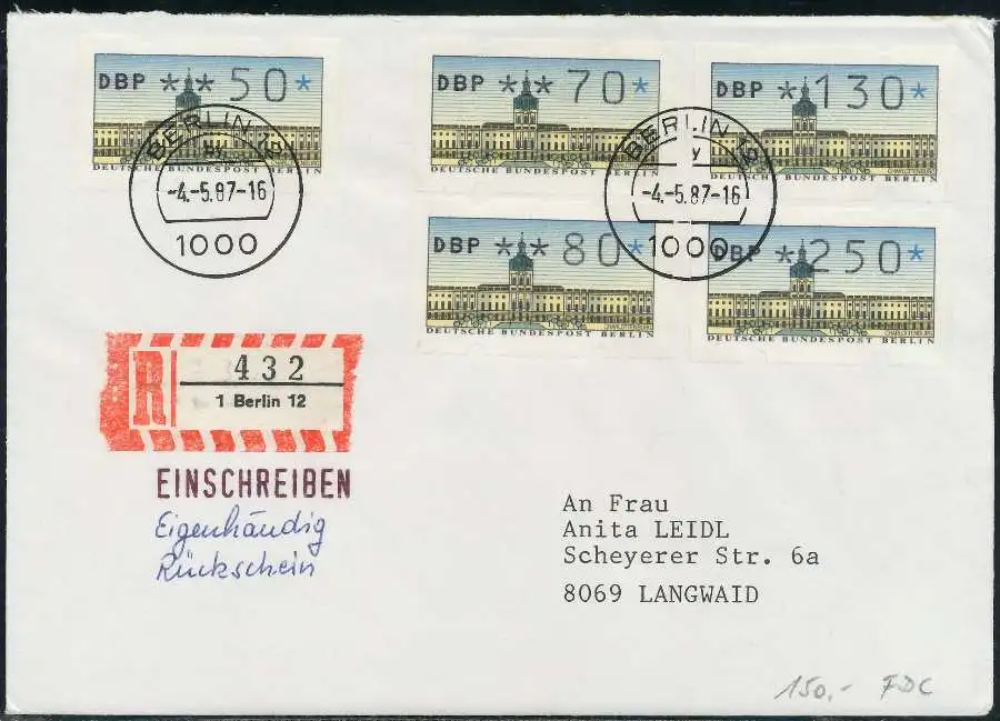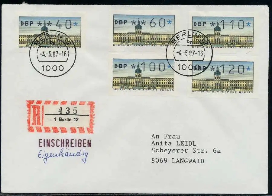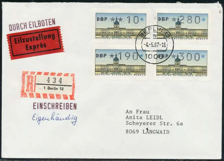ATM-Ausgabe von 1987, Werte wie aus dem Versandstellen Satz VS1, verteilt auf 3 Briefe, jeweils mit Ersttagsstempel, Einschreiben, Eilboten, Eilzustellung, Eigenhändig, Rückschein